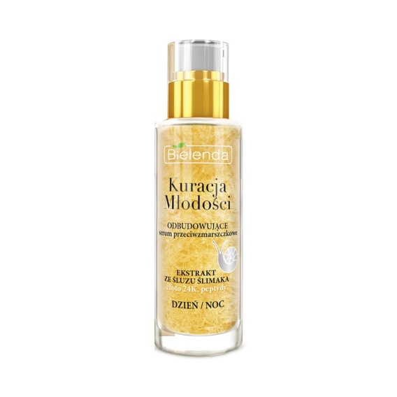 Skoncentrowane serum odbudowujące Bielenda Kuracja Młodości to luksusowa kuracja przeciwzmarszczkowa z 24K złotem i ekstraktem ze śluzu ślimaka. Intensywnie regeneruje, ujędrnia i wygładza cerę dojrzałą. Zawiera cenny olej z opuncji figowej. Idealne do stosowania na dzień i noc pod krem.